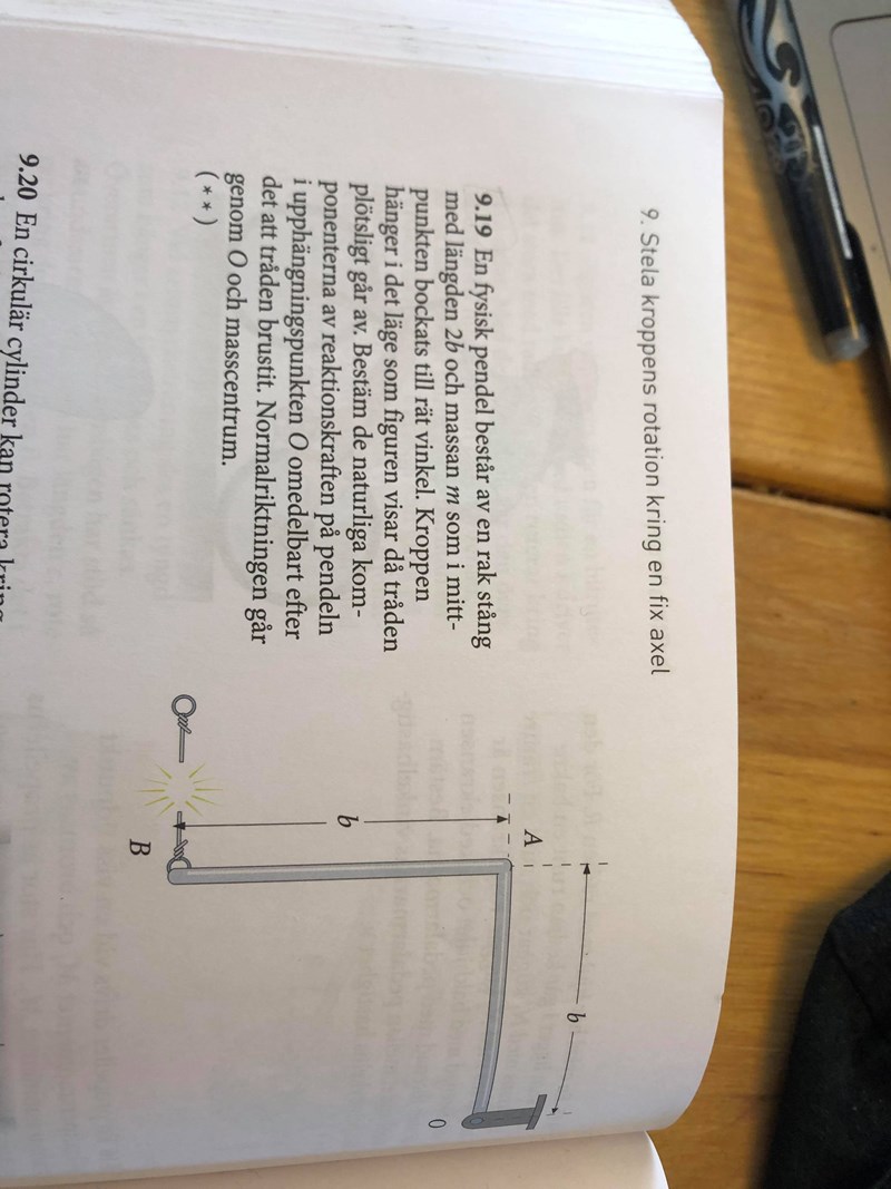 En fysisk pendel består av en rak stånd med längden 2b och massan m som i mittpunkten bockats till rät vinkel. Kroppen hänger i det läge som i figuren visar då tråden plötsligt går av. bestäm de naturliga komponenterna av reaktionskraften på pendeln i upphängningspunkten O omedelbart efter det att tråden brustit. Normalriktningen går genom O och masscentrum.