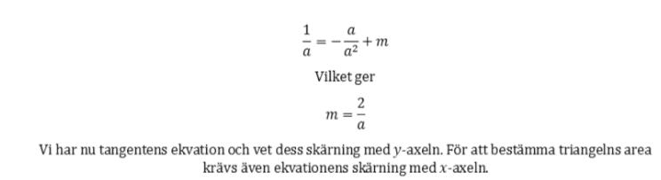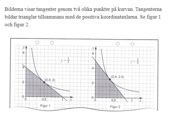 Problemet består av två delar. Vi har funktionen (kurvan) . Och genom en punkt på kurvan dras en tangent som även skär x-axeln och y-axeln. Och då gäller det att beräkna arean i den triangeln som är gråmarkerad på bilden.