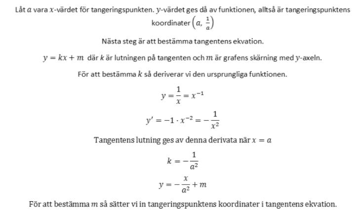 Det är i tangeringspunkten som x sätts till a. Och sedan får man fram lutningen (k-värdet) och var tangenten skär x-axeln och y-axeln.