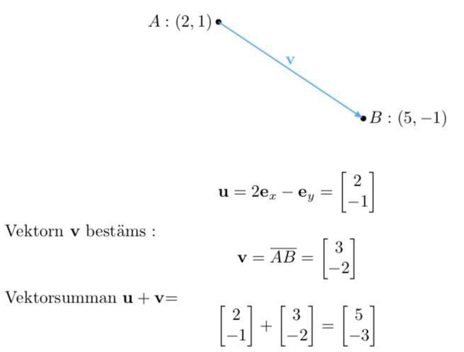 Yngve skrev:fysikoken skrev:Vektorn är given. har startpunkt (2,1) och slutpunkt (5,-1). beräkna . eftersom vektorn v startar i punkt (2,1) borde väl vektorn u sluta i punkten (2,1)(?) alltså men facit hävdar att det ska bli varför?