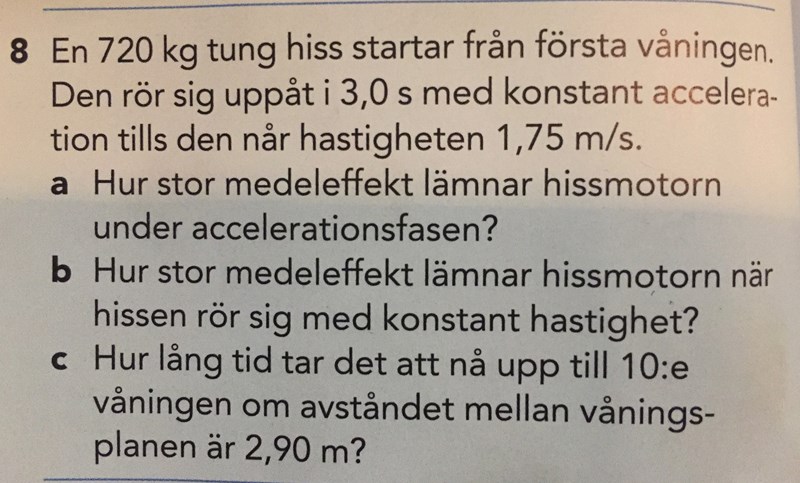 Ramanujan skrev:En 720 kg tung hiss startar från första våningen. Den rör sig uppåt i 3,0 s med konstant hastighet 1,75 m/s.