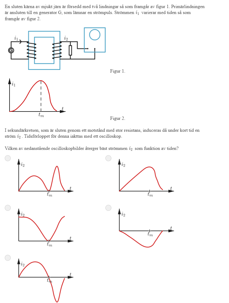 Hej! Har lite svårt med att fullständigt förstå den här uppgiften. Har inte jätte bra koll på hur högerhand regeln är eftersom jag inte riktigt ser hur spolen är lindad, ser inte om den är motsols eller medsols lindad kring metallen då det typ ser ut som att den svänger lite precis innan? Hur som helst antar jag att det är alternativet längst ner som stämmer eftersom den visar sig göra en självinduktion när i1 plötsligt ändras. Kan dock inte riktigt förklara varför kullen före tm sker?