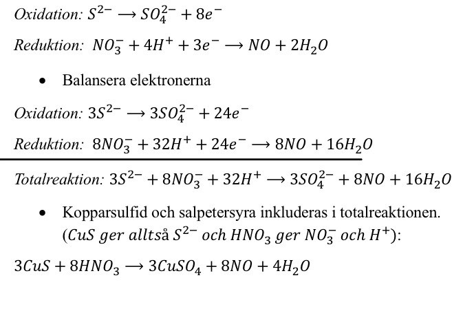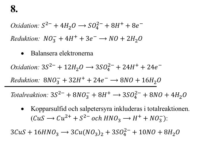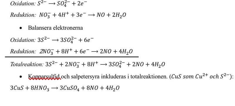 Hej, jag har löst en uppgift i oxidation-reduktion som jag ska lämna in och jag undrar om någon kan rätta min lösning ifall jag har missat något eller gjort fel någonstans. Frågan var: "koppar förekommer ofta som sulfidmineral, CuS. Första steget i utvinningen av koppar från CuS är att lösa upp mineralet i salpetersyra. Detta oxiderar sulfid till sulfat och reducerar salpetersyra till NO. Skriv oxidations och reduktions halvreaktionerna, balansera och skriv den balanserade redox reaktionen."