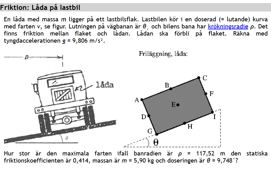 Jag vet inte riktigt vart jag ska börja. Jag ritar ut ett kraftdiagram med tyngdkraft, friktionskraft samt normalkraft. Jag tror även att vi ska använda oss av formeln F=mv^2/p på något sätt men inte säker på hur jag får ut kraften F till den formlen. Någon som har några tips om hur jag kan gå tillväga?
