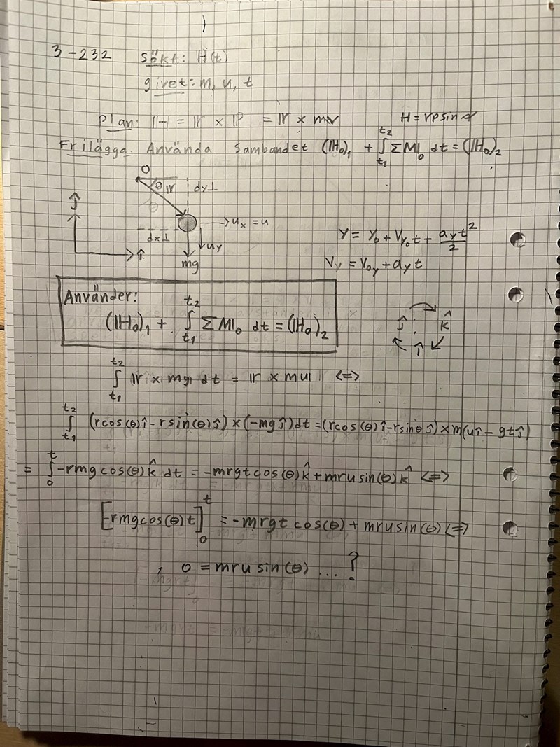 Jag vet att varken theta eller r är givna, men jag hade hoppats på att de skulle ta ut varandra i slutändan. Men det gick inte bra, då jag får ett tokigt svar: 0 = m*r*u*sin(theta). Är det någon som vet varför det inte fungerar?