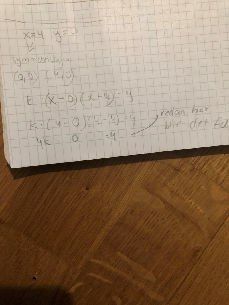 Det du gör är inte fel, men det ger dig ingen extra information om k. Du väljer x-koordinaten 4, som är ett av nollställena, och sätter in i ekvationen. Ekvationen blir då 4k*0 = y, dvs 0 = y. Men det visste vi ju redan, eftersom (4,0) är ett nollställe.