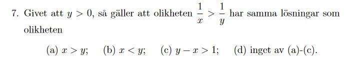 Exempel: x = -1 och y = 1 är en lösning till olikheten x < y men inte till 1/x > 1/y.