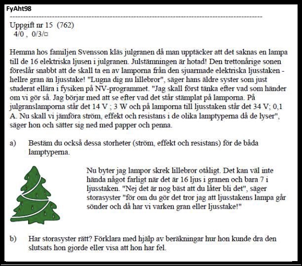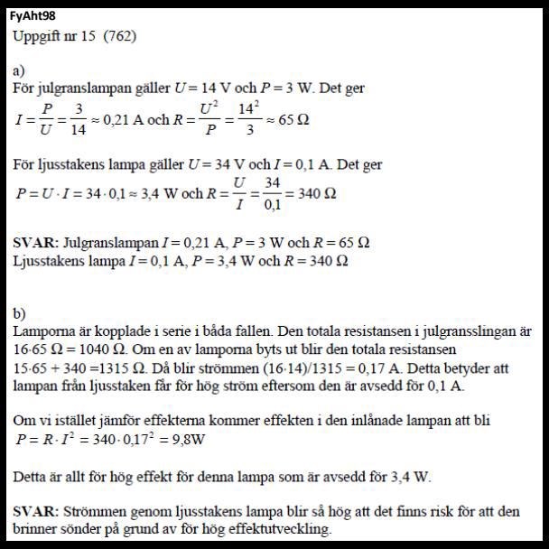De säger i b) att strömmen blir 16x14V/1315Ω, alltså beräknar de spänningen i slingan som 16x14V (16 granlampor x 14V/granlampa). Jag undrar varför det blir så? Hur ska jag veta att spänningen inte är 15x14+34V (15 granlampor x 14V/granlampa + 1 staklampa x 34V/staklampa), dvs. varför förändras inte spänningen över kretsen då jag kopplar in en annan resistor? Hjälp!