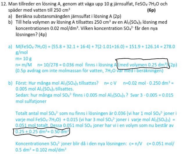 Volymen av lösning A + lösning Al2(SO4)3 = 250 cm³ + 250 cm³ = 500 cm³ = 0.5 dm³
