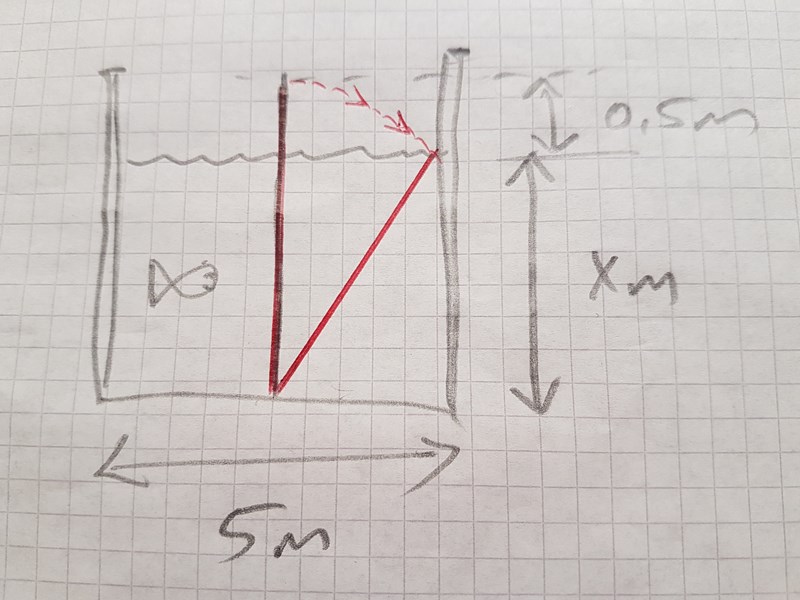 En kvadratisk brun är ena sidan 5 m.Mitt i brunne växer ett vasstrå. Den sticker upp en halvmeter ovanför vatten ytan. När en povke får tag i strået topp och drar den mot mitten på sidan räcker strået precis till avttenytan. Hur djur är brunnen?