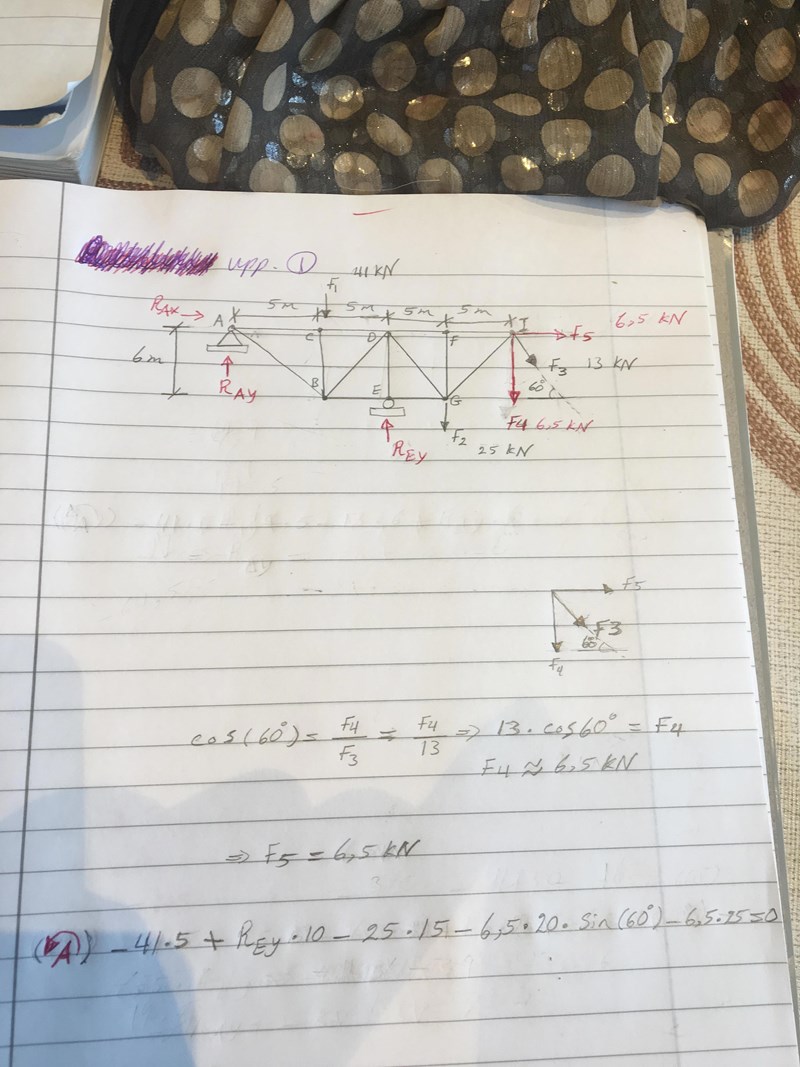 på denna uppgift skall man beräkna alla upplagskrafter , jag har börjat med att moment i punkt A och satt ekvationen som på bilden.. frågan är om jag gjort rätt?