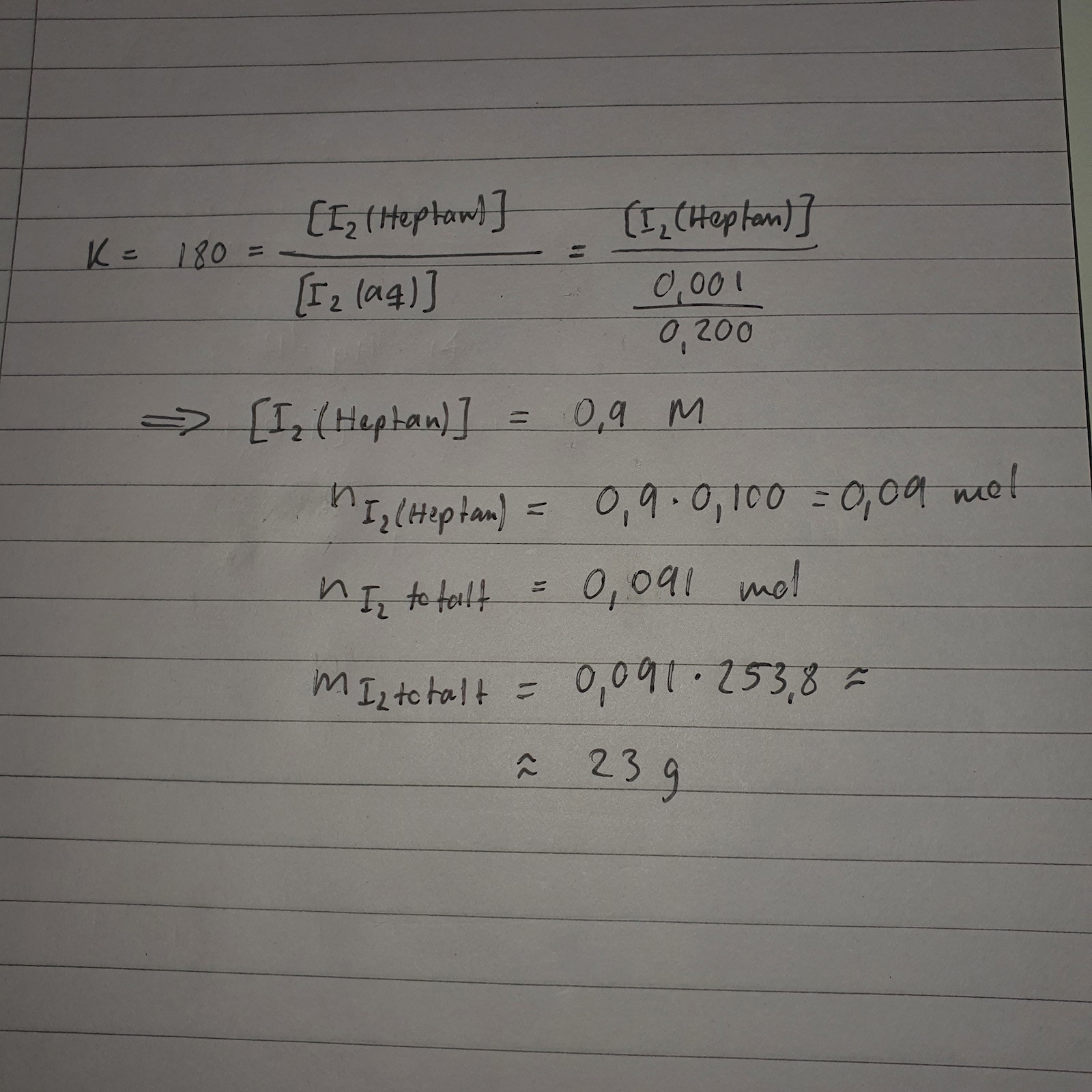 "Reaktionen I2(aq) ⇔ I2(heptan) studeras. En okänd mängd jod vägs upp och löses upp i 100 ml heptan. Heptanfasen skakas sedan till jämvikt med 200 ml vatten. Med hjälp av redoxtitrering bestäms sedan substansmängden av jod i vattenfasen vara 0,001 mol jod. Hur stor mängd jod vägdes upp i försöket? Jämviktskonstanten är 180 under rådande betingelser?"