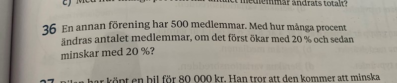Enklast är nog att först beräkna hur stor en ökning med 20% är och sedan beräkna hur mycket som blir kvar när det minskar 20%.