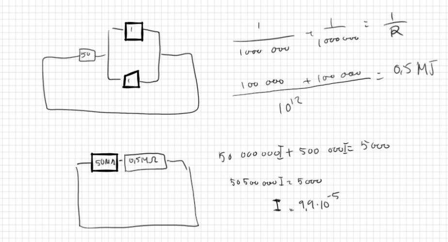 Du kan rita om kretsen som en "vanlig" krets med 50 Mohm seriekopplat med en parallellkoppling av 2st 1 Mohm motstånd. Vilken ström får du då i kretsen och vilken spänning får du över parallellkopplingen.