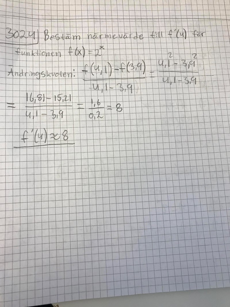 bestäm ett närmevärde för f’(4) för funktionen f(x) =2^x genom att bestämma den symmetriska ändringskvoten f(4,1)-(3,9)/ 4,1-3,9
