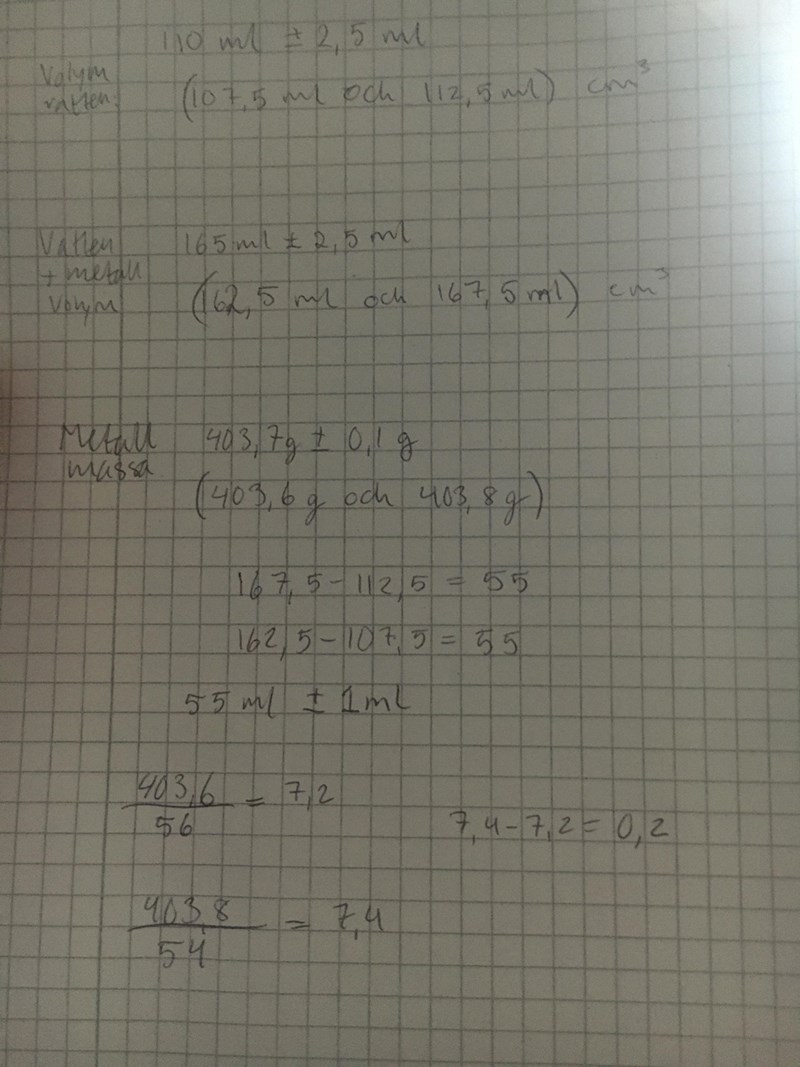 Så volymen av metallbiten är . (OBS felet blir större med kalkylation och inte mindre!)