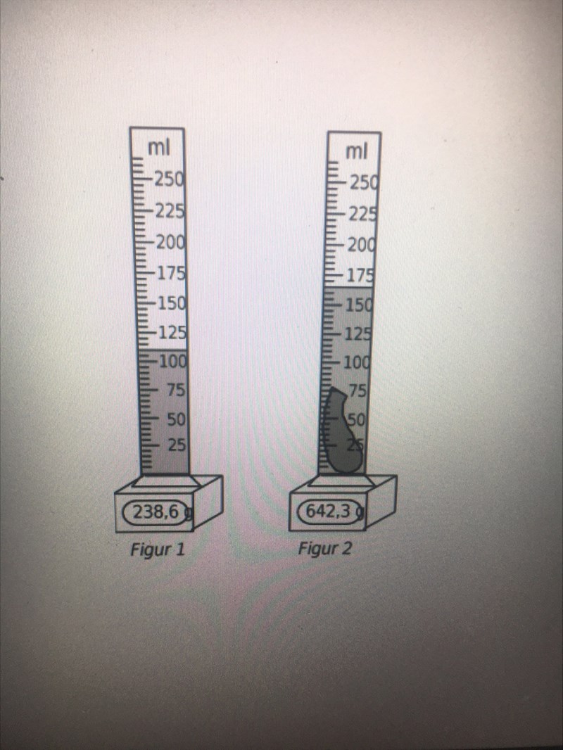 I ett mätglas häller man lite vatten och placerar mätglaset på en våg. Se figur 1. Därefter lägger man en metallbit i vattnet. Se figur 2.