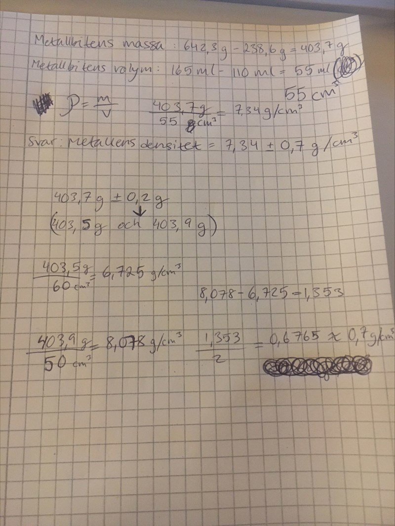 Densiteten är 7,34 g/cm³. Jag behöver hjälp med hur man gör en uppskattning av felet i mätningarna och i uttrycket för densiteten. Det är alltså 5 ml mellan varje streck. Här ovanför är ett försök av att lösa uppgiften