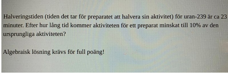 Riktigt men jag tycker att du ska börja med att sätta upp formeln för radioaktivt sönderfall och via hur du kommit fram till din ekvation.
