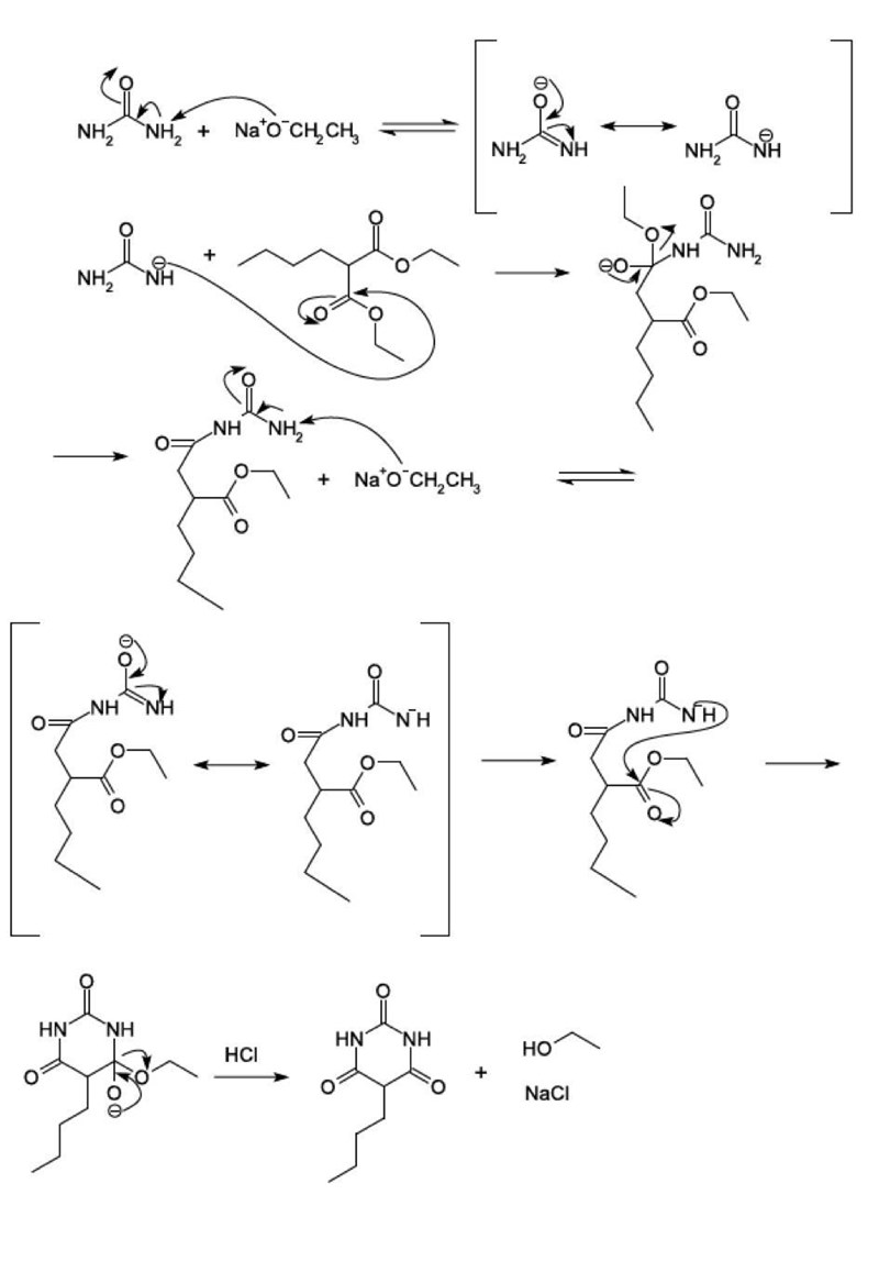 Hej! Tack så mycket för din tid, jag ritade inte dietylmalonat i allra första steget då urea blev deprotonerad först men jag har ritat dietylmolonat i steget under. Men vår lärare berättade att urea är ett väldigt stabil ämne så jag tänker att det kanske kan vara något annat steg som driver reaktionen åt höger. Vad tycker du? :)