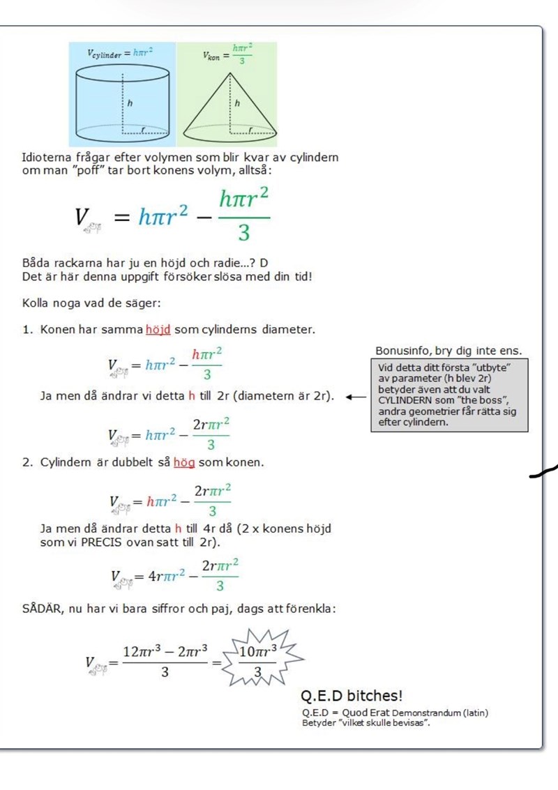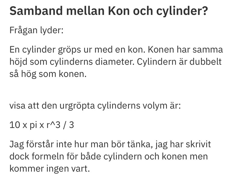 Nästa steg skulle vara att sätta upp uttryck för cylinderns och konens volym.