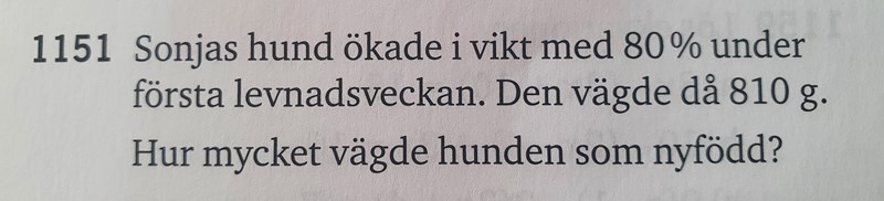 Antag att födelsevikten var x kg. Hur många kilo ökade vikten första veckan, alltså vad är 80 % av födelsevikten?