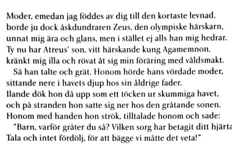 SvanteR skrev:Texten handlar om Achilles. Det syns inte i ditt textutdrag men man vet det om man har läst det som kommer innan. Achilles är arg på Agamemnon. Achilles har gått ned till havet och ropar på sin mor, som är en slags havsgudinna. Han berättar att han tycker att han är värd mer ära och respekt, och att han tycker att Agamemnon har kränkt honom. Hon kommer upp ur havet och frågar honom varför han är arg.