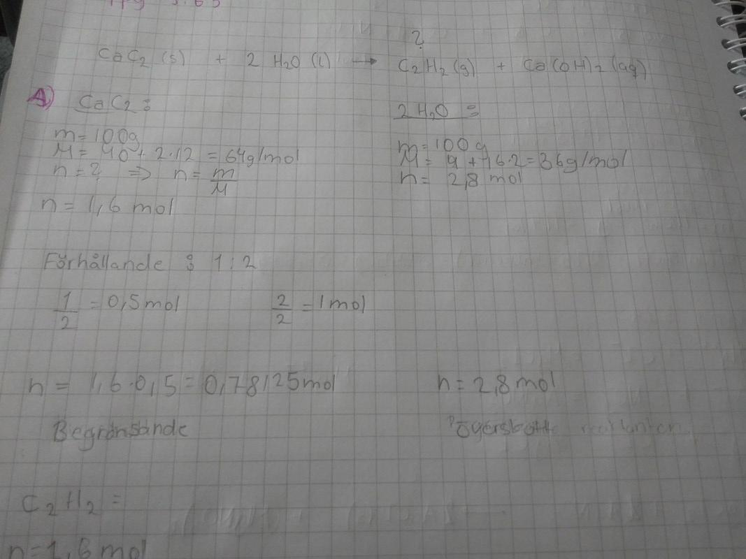 Kalciumkarbid har molmassan 64 g/mol, så 100 g kalciumkarbid är 100/64 = 1,6 mol.