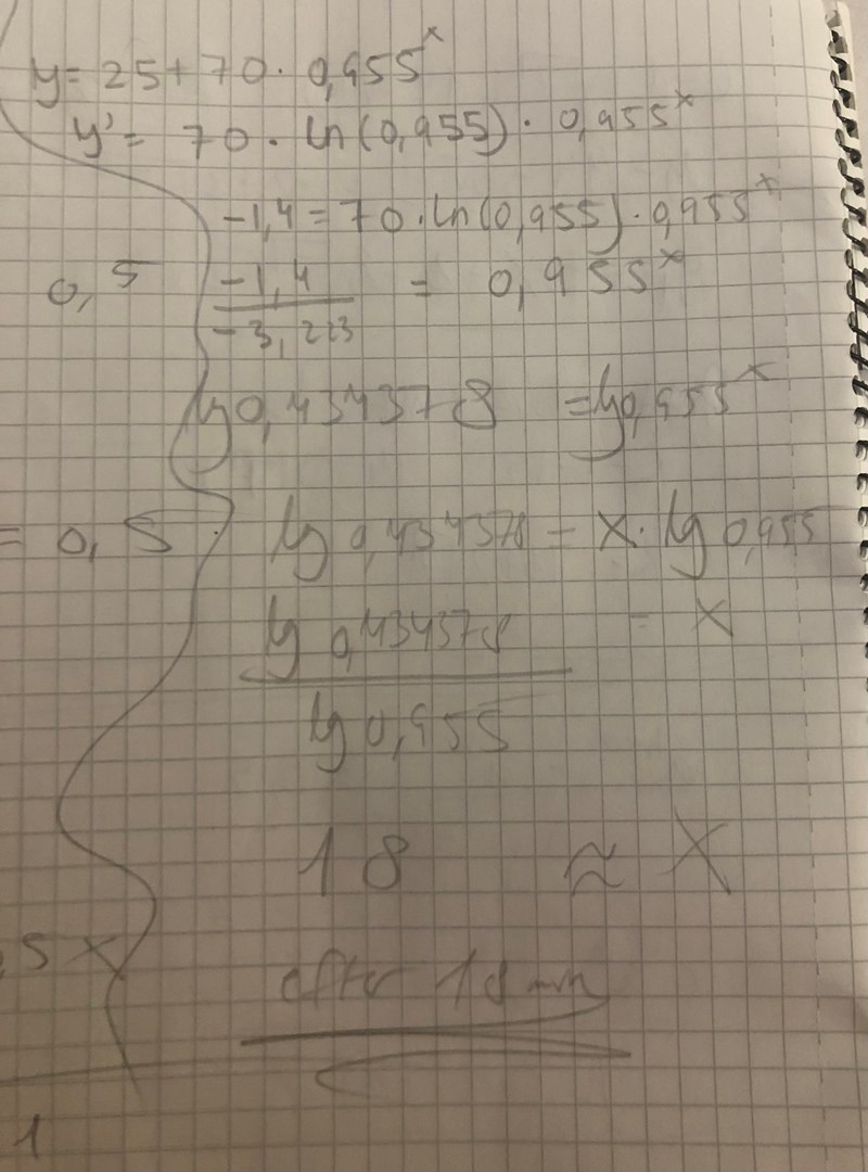 På en uteservering serveras kaffe. Temperaturen hos kaffet minskar enligt y =25 + 70 x 0.955 upphöjt med x grader, där x är tiden i minuter efter det att kaffet har serverats.
