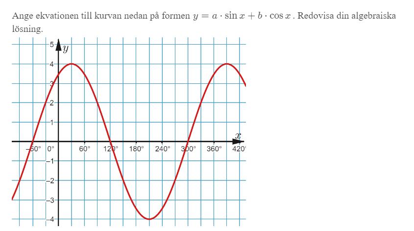 Vi ser i figuren att f(x) går mellan -4 och 4. Det innebär att koefficienten framför är 4 (kan inte vara -4 pga rot)