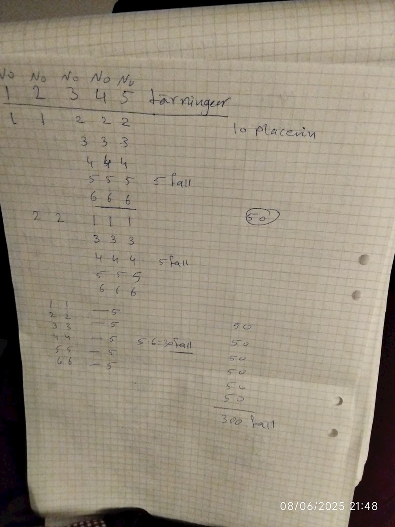 4-4-4-3-3 skall väl räknas som samma utfall som 4-3-4-4-3, gissar jag?