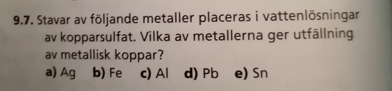 Jag ska skriva reaktionsformler för metaller som ger utfällning av metallisk koppar i vattenlösningar av kopparsulfat.