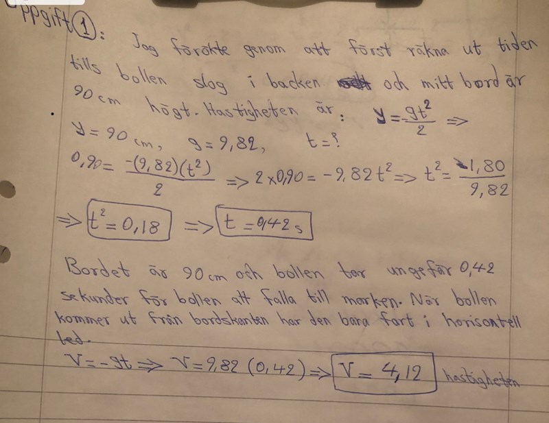 Denna uppgift ska du genomföra experimentellt. Ta fram en kula eller en boll. Sätt den på bordet och rulla iväg bollen så att den rullar utanför bordet och ner på golvet. Mät hur långt från bordskanten bollen landar. Anteckna bordets höjd. Hur stor hastighet hade bollen när den lämnade bordet? Bortse från luftmotstånd!