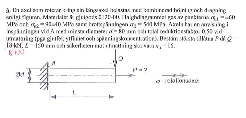 "En axel som roterar kring sin längsaxel med kombinerad böjning och dragning enligt figuren."