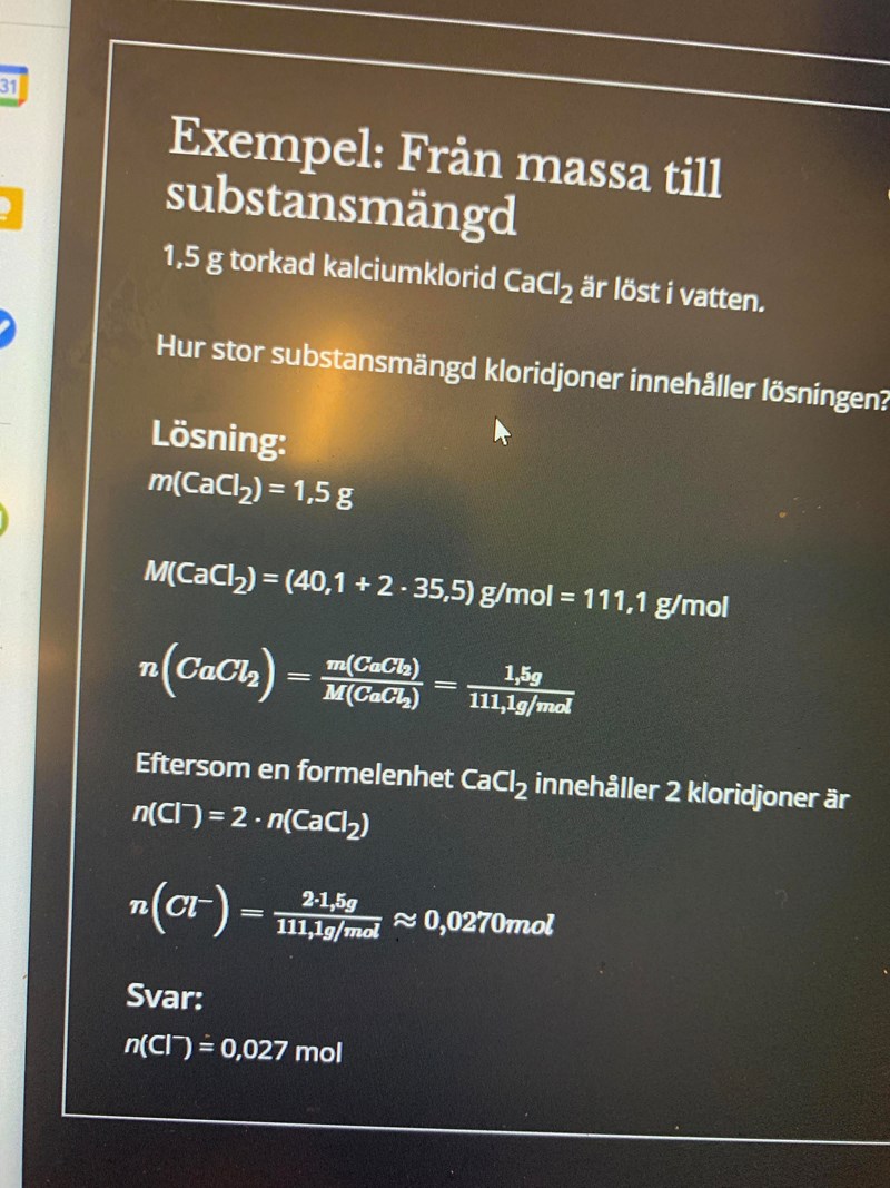 När jag tänkte efter. När vi räknar ut n så får vi ju antal CaCl2 molekyler. Så för att få Cl2 så multiplicerar man med 2 för att antal cl2 molekyler e dubbelt så många ELLER?