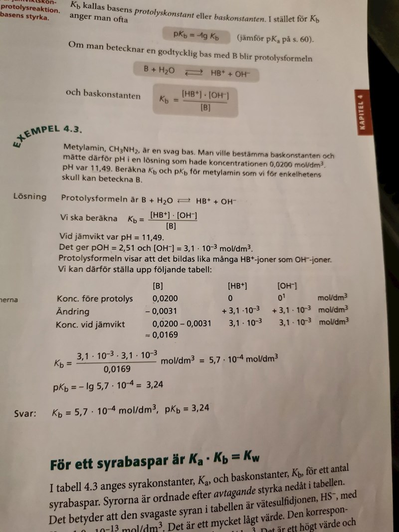 Det står i uppgiften att pH = 11,49, och du kommer säkert ihåg att pH + pOH = 14. När du vet pOH kan du beräkna [OH-] genom formeln [OH-] = 10-pOH.