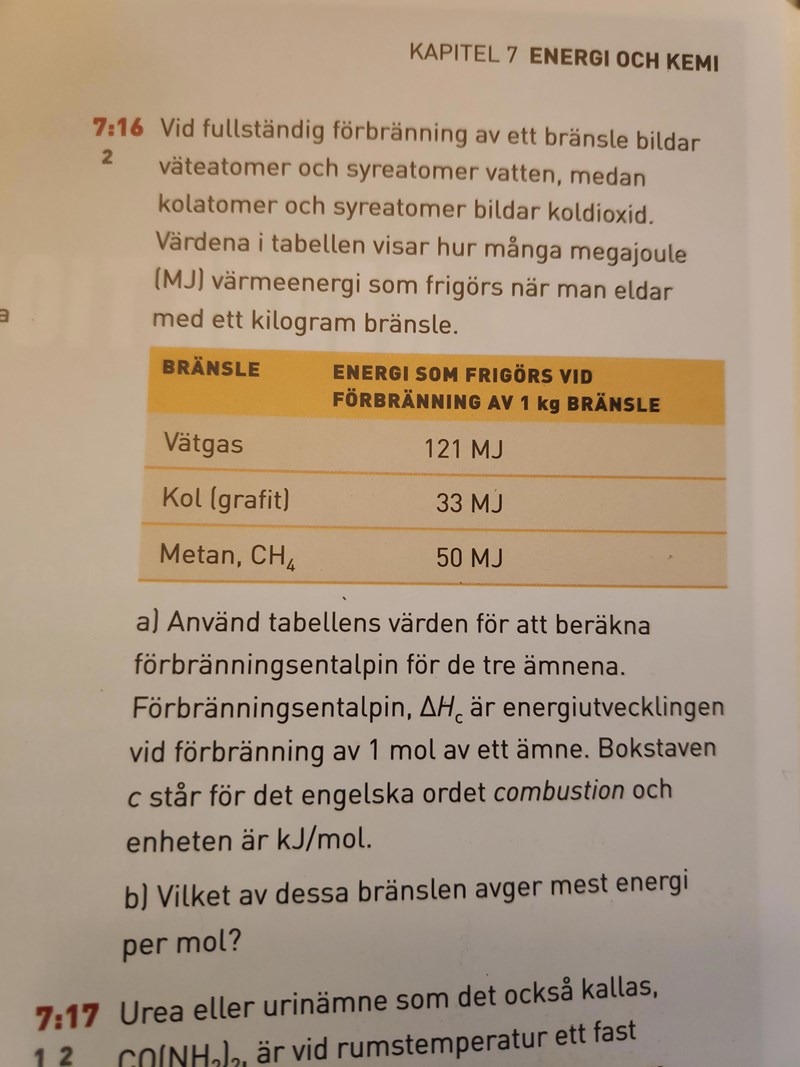 Tabellen ger hur många MJ som frigörs när 1 kg vätgas/kol/metan förbränns. Din uppgift är att beräkna hur många MJ som frigörs när 1 mol av ämnet förbränns. Det du behöver (förutom värdena i tabellen) är molmassorna.