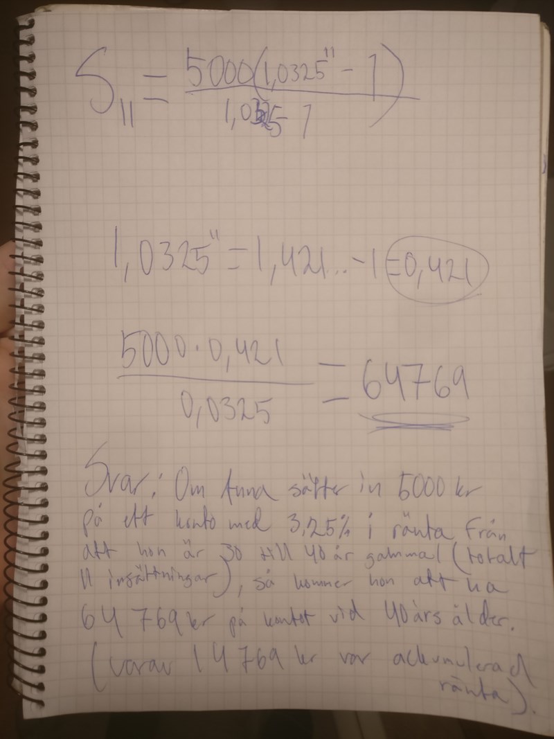Om hon sätter in 5000 kr på ett konto med räntan 3,25 %, hur mycket finns det då efter 10 år?