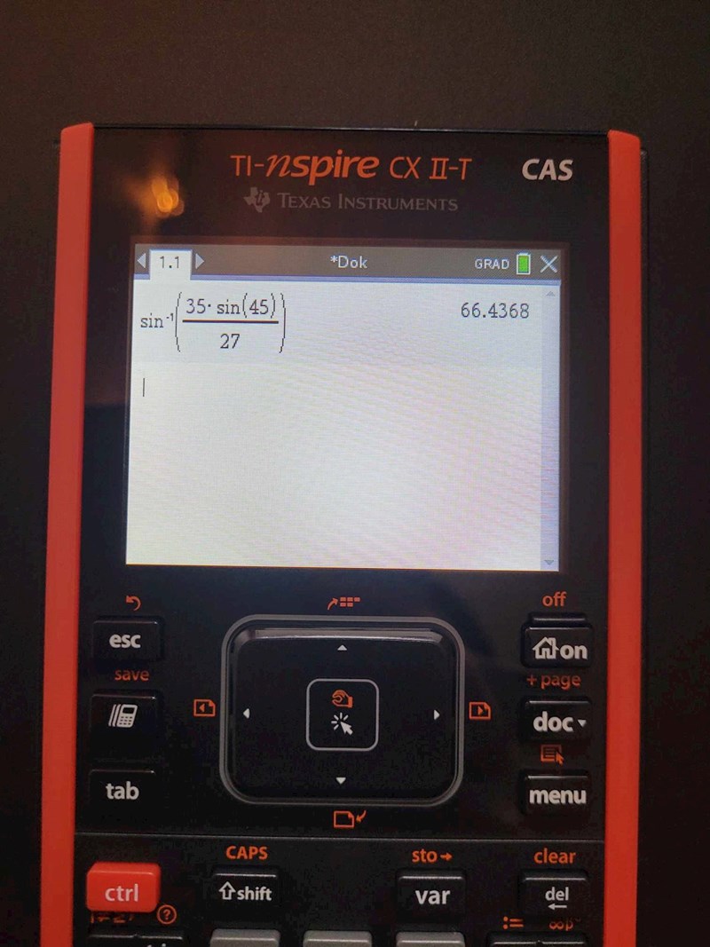 Den är inställd på radianer. Notera att det står "RAD" vid batterisymbolen uppe i det högra hörnet.