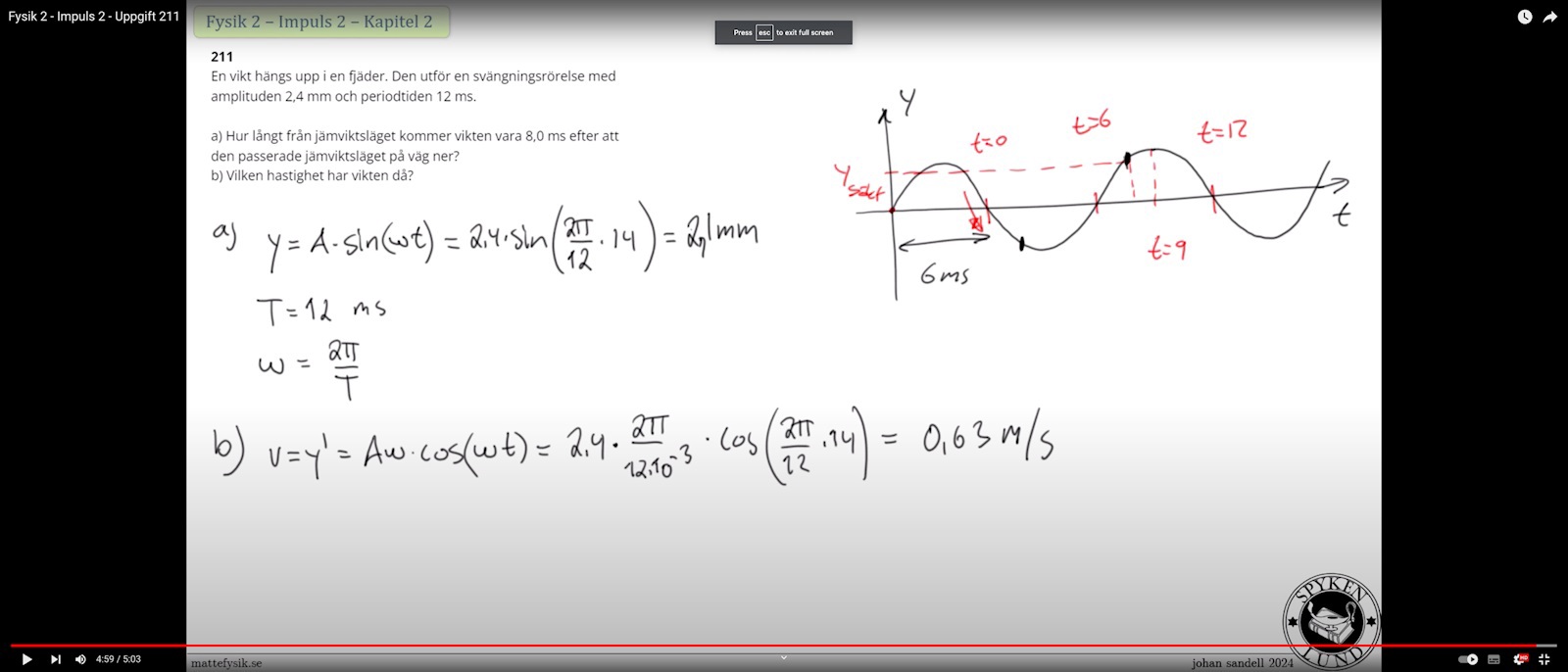 Hej! Har en fråga angående b). Jag skrev precis som i denna lösningen men däremot gjorde jag inte om 12 ms till sekunder alltså 12 · 10^-3 s. Fick dock ut rätt svar. Däremot trodde jag att det var 0,63 mm/ms. Hur bör jag resonera här? När är det okej att inte göra om till SI-enheter i uträkningen? Videoläraren nämner också att enheterna tar ut varandra inom cos () men inte utanför. Hur kommer det sig?