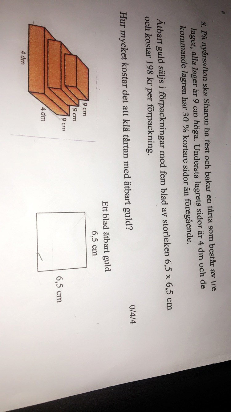 Men du vet att mellersta lagrets sida är 30% kortare än understa lagrets sida (som är 4 dm).