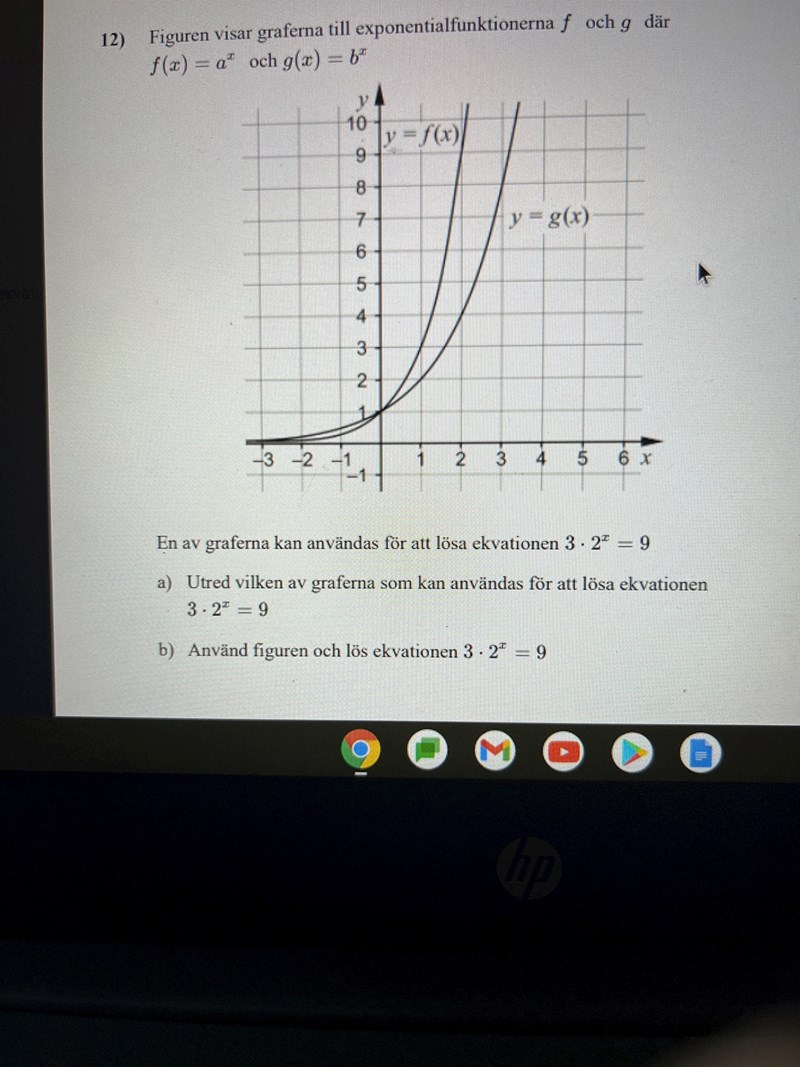 Utred vilken av graferna som kan användas för att lösa ekvationen 3•2^x=9