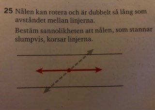 Jag kan börja med att säga att jag inte förstår vilken funktion den streckade gråa ''nålen'' på bilden fyller. Är det för att illustrera att den röda nålen är roterbar, eller är det tänkt att man ska räkna ut sannolikheten för att nålen hamnar i just det läge som den gråa figuren visar? Om det är det senare, så tycker jag att det är märkligt för att en nål kan korsa linjerna på flera sätt än den streckade figuren visar. Eftersom det finns oändlgit många lägen där den röda nålen kan korsa de horisontella linjerna, ville jag för enkelhetens skull räkna ut komplementhändelsen: sannolikheten att den röda nålen inte korsar linjerna. Men där finns också många lägen. Hur bör jag då gå till väga?