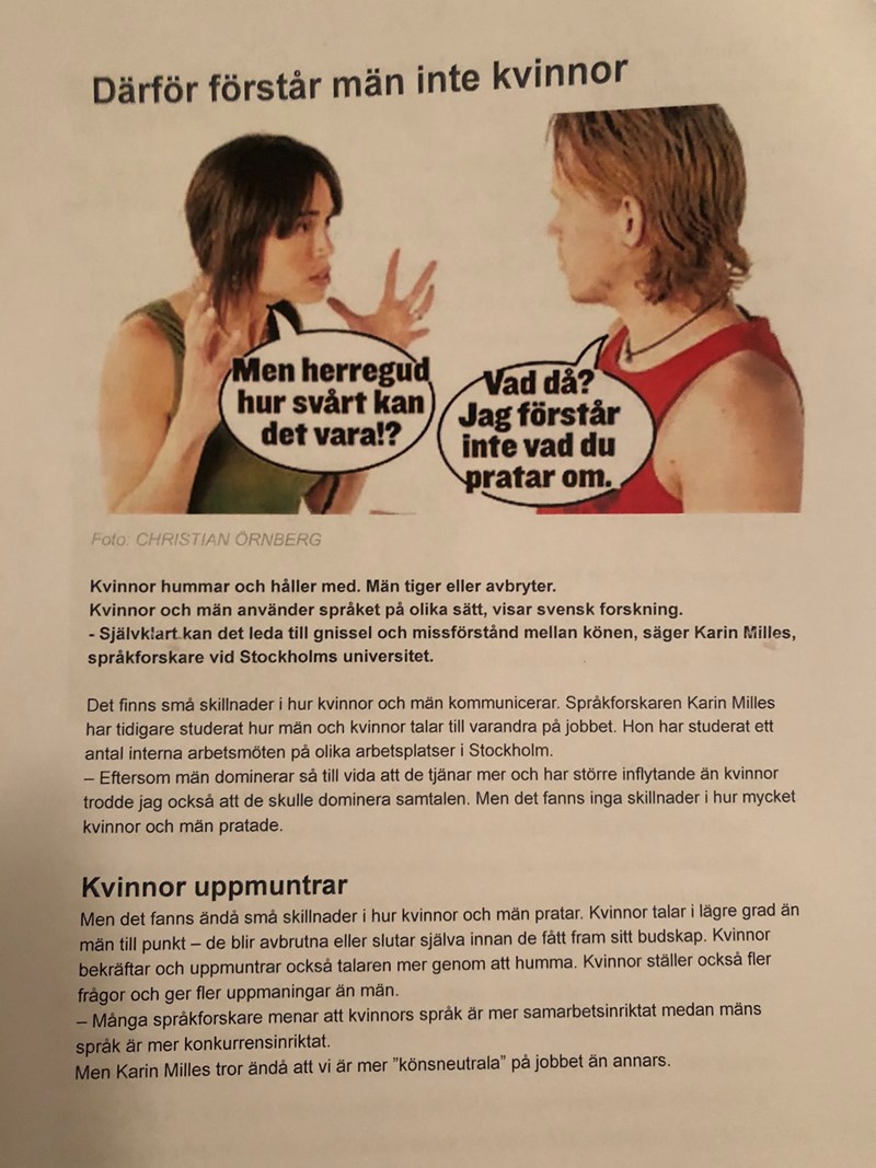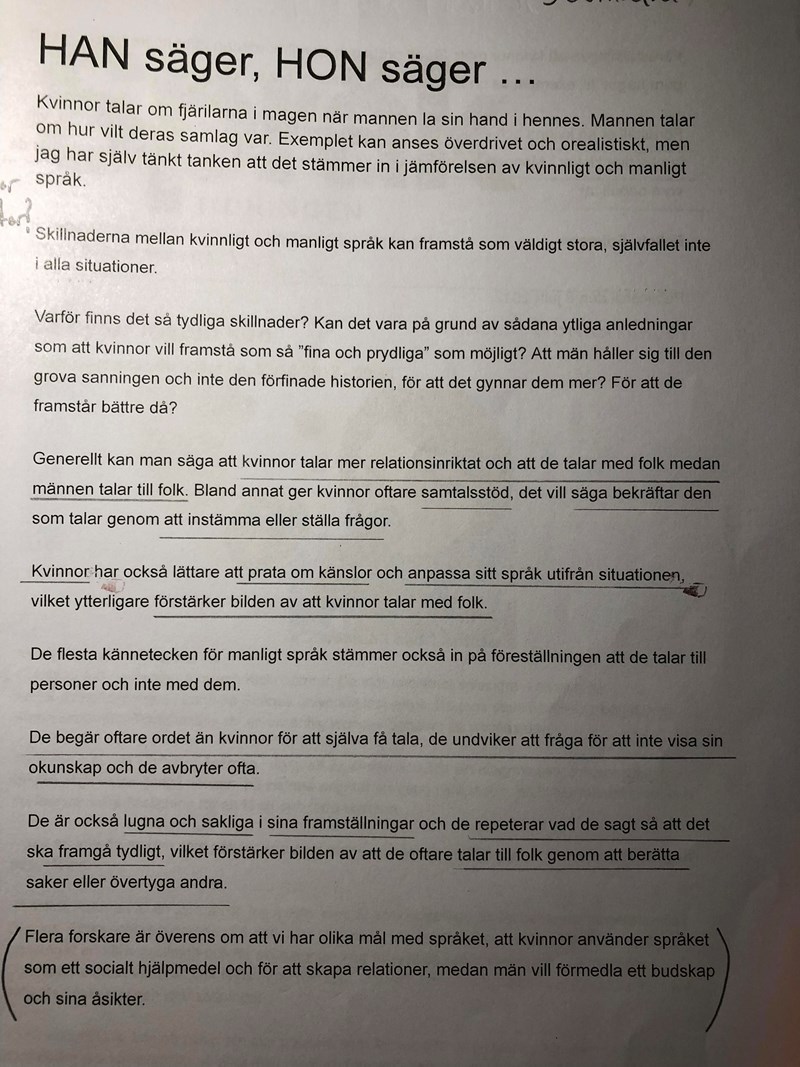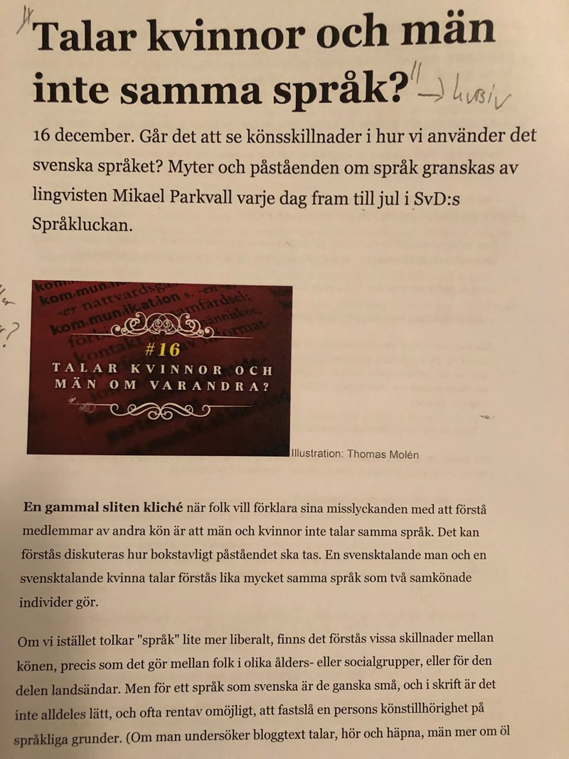 Hej Pluggakuten. Jag ska skriva en utredande uppsats som ska handla om manligt och kvinnligt språk. Lite mer precist så frågas det om det går att se några könsskillnader i hur vi använder det svenska språket? Jag har fått fyra st artiklar som berör detta ämne som jag tänkte bifoga här så att ni får en bättre bild. Jag har däremot ett problem. Jag får inte upp en relevant frågeställning som ska beröra detta ämne i stort. Jag har gått runt och funderat men kan inte fånga någon konkret frågeställning för uppgiften... Till min fråga: Kan ni skumläsa de artiklar som jag bifogar så kanske ni kan hjälpa mig till en bra frågeställning.