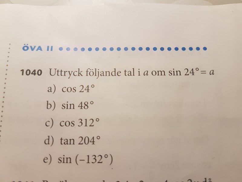a) och b) har jag löst. Men hur skall man göra med cos 312°? Det verkar som att man på något vis måste förbereda talet för formlerna för dubbla vinklarna, men vet ej hur man ska tänka där riktigt. Finns inte något klart mönster att tolka.