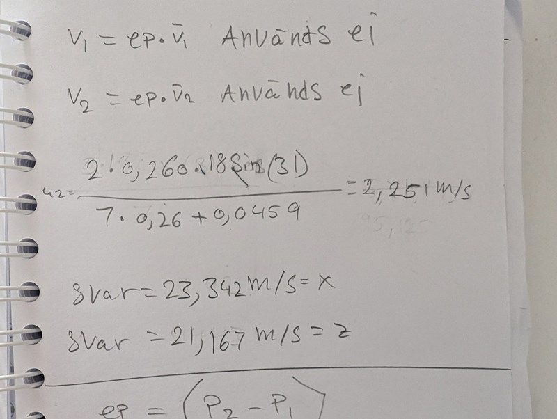 Pelle slår till en two-piece boll med järnsexan. Klubbhuvudet har vid träff farten 18 m/s.Vilken hastighet och spinn får bollen direkt efter utslag