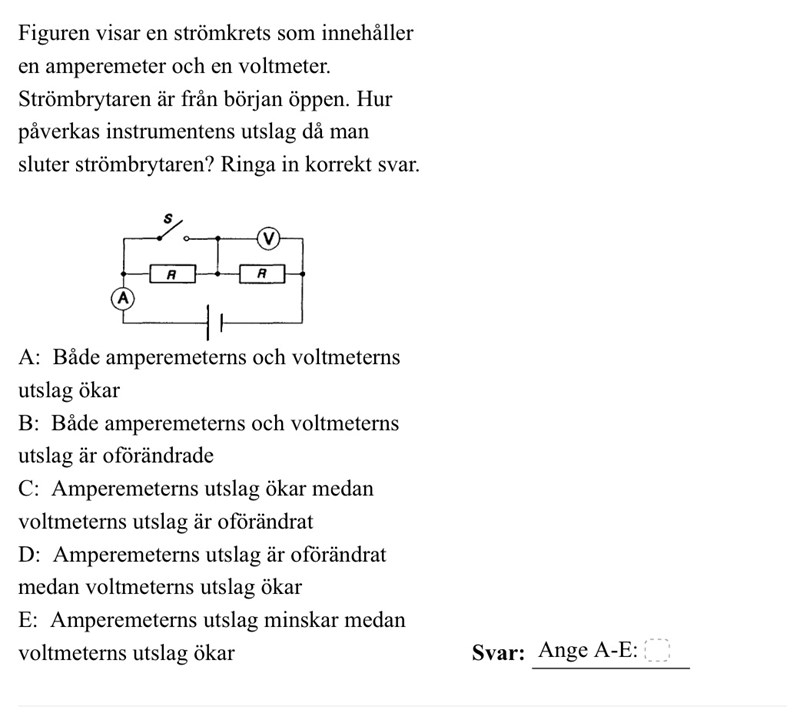 Varför blir svaret A? Om S sluts så tilläggs ännu en gren men det innebär väl bara att strömmen får fler vägar att flöda genom? Jag tänkte mig att amperemeterns utslag skulle vara detsamma men jag var osäker på vad voltmetern skulle visa. När strömbrytaren är öppen så finns det bara en väg som ström flödar till voltmetern (vid förgreningen mellan resistenserna), när strömbrytaren sluts finns det ytterligare en väg som ström flödar till voltmetern (grenen med strömbrytaren) men jag vet inte riktigt om det innebär att voltmeterns utslag minskar/ökar.