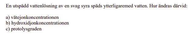 Jag är väldigt osäker över alla tre uppgifterna. Om man späder lösningen med vatten så kommer ju koncentrationen av joner i lösningen (H+ och OH-) att sjunka, men det är inte alls logiskt eftersom då kommer inte längre vara konstant
