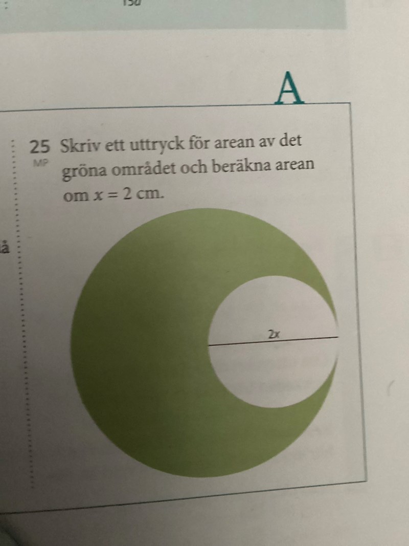 Om x = 2 så vit area 4 pi och grön area 12 pi.
