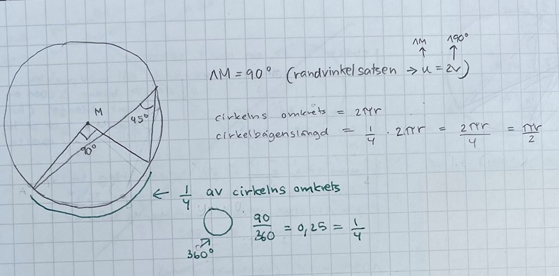 Längden av cirkelbågen från A till B är alltså en fjärdedel av hela cirkelns omkrets.